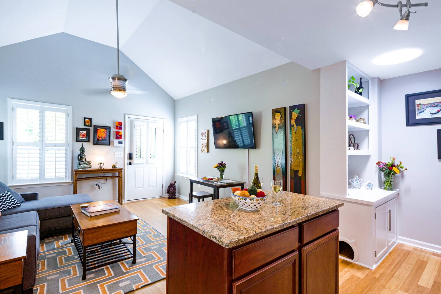 This private unit is within a home set up like a duplex with two units within the house. Sound travels easily between the two units (footsteps, voices, laughter, etc) so I ask that both guests respect the guests on the other side of the wall. Well stocked kitchen allows easy cooking/preparing of meals. Organic, fair-trade coffee provided. This unit is eco-friendly with bamboo flooring, no VOC paint, organic mattress & sheets, and non-toxic personal care items. Living room has a 49" 4K Ultra HD Smart TV with Netflix and Prime Video.