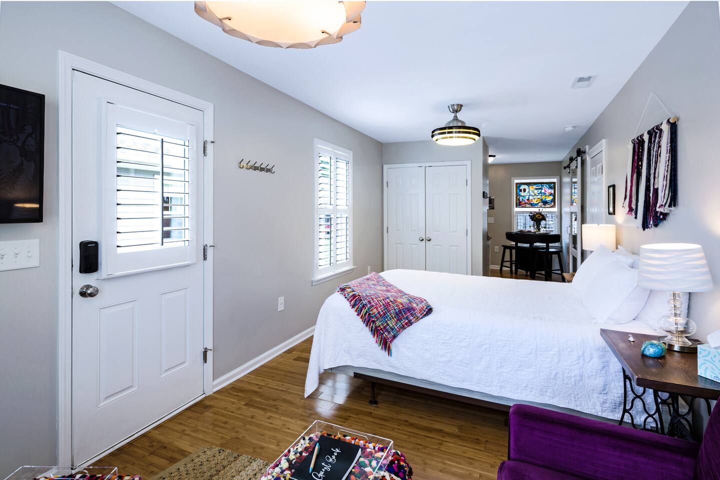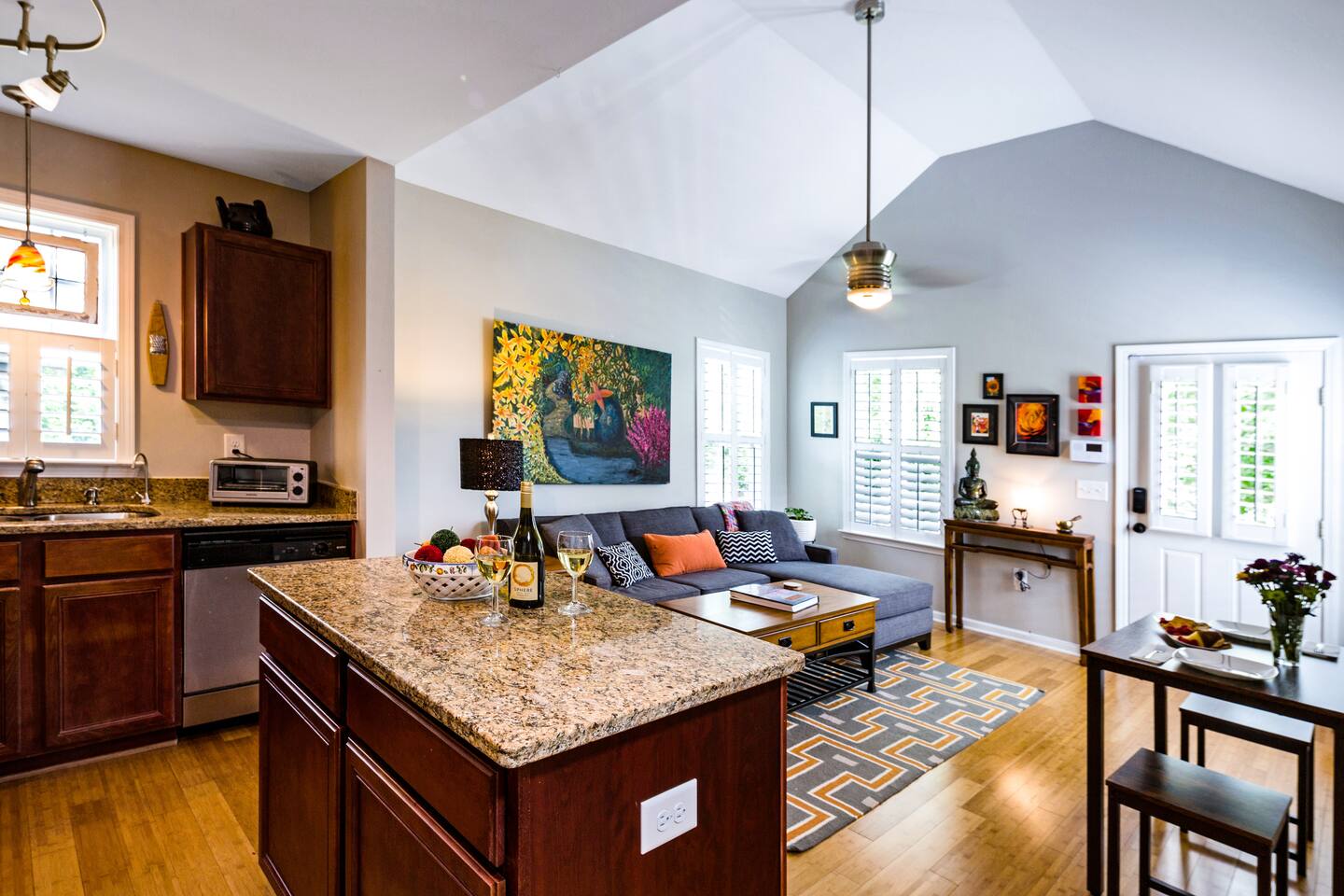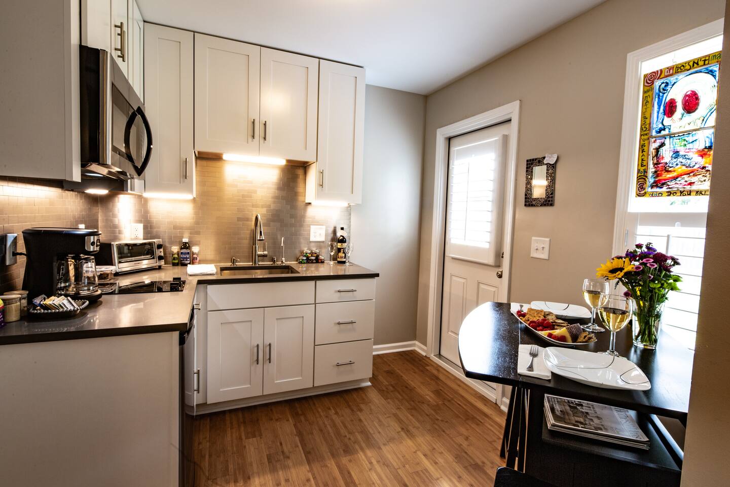 Two dining tables are available, each seating two guests. Since they’re in different areas of the house, a party of four wouldn’t be able to sit at a single table, but everyone will still have comfortable dining space. There is a $75 pet fee which will automatically be applied when you add the pet to the reservation.