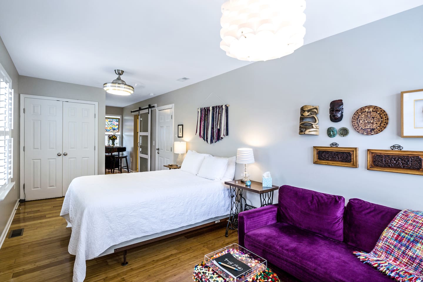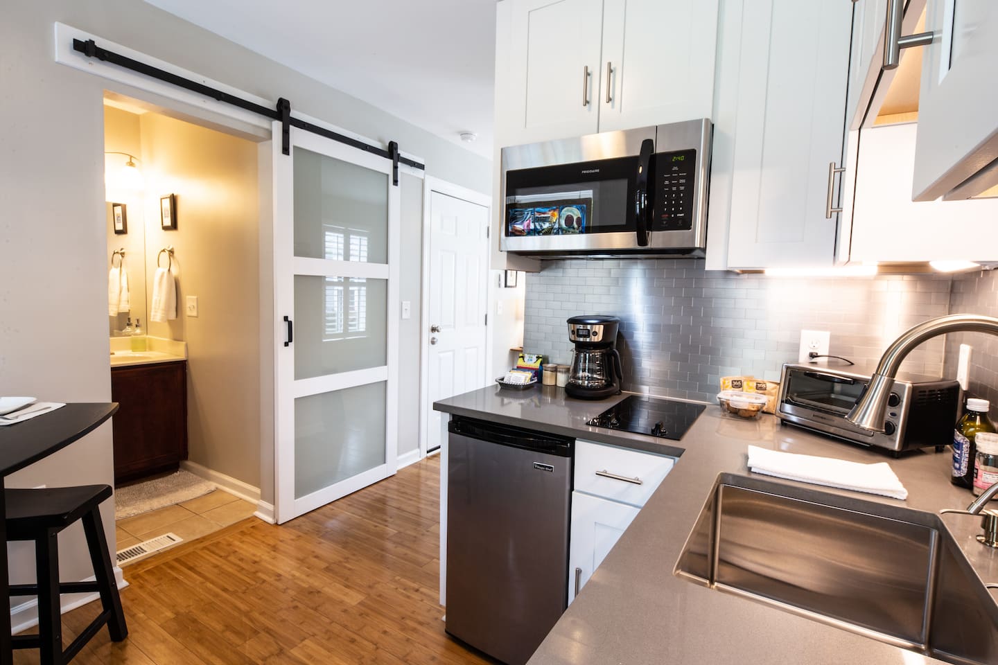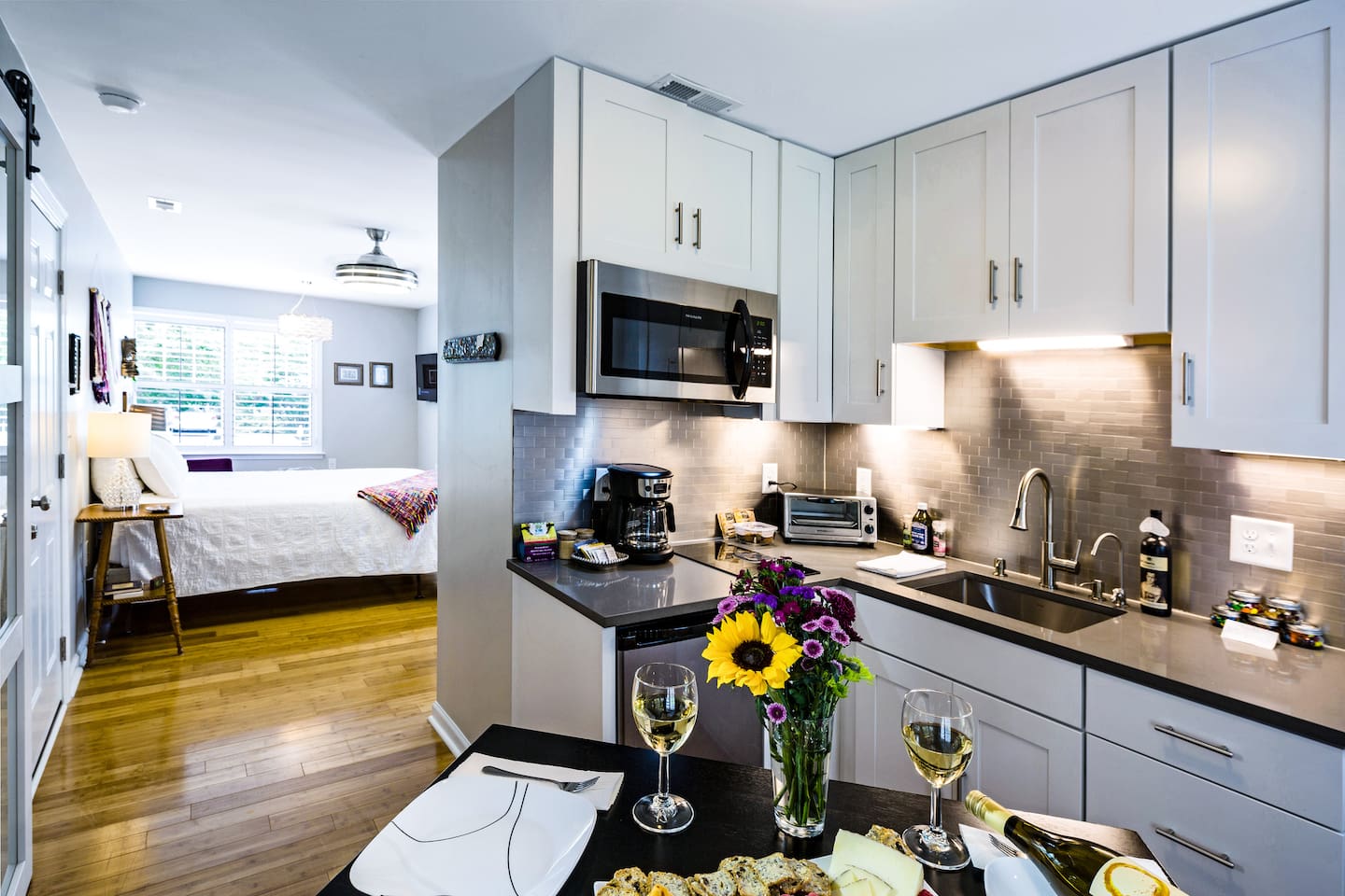 Two dining tables are available, each seating two guests. Since they’re in different areas of the house, a party of four wouldn’t be able to sit at a single table, but everyone will still have comfortable dining space. There is a $75 pet fee which will automatically be applied when you add the pet to the reservation.