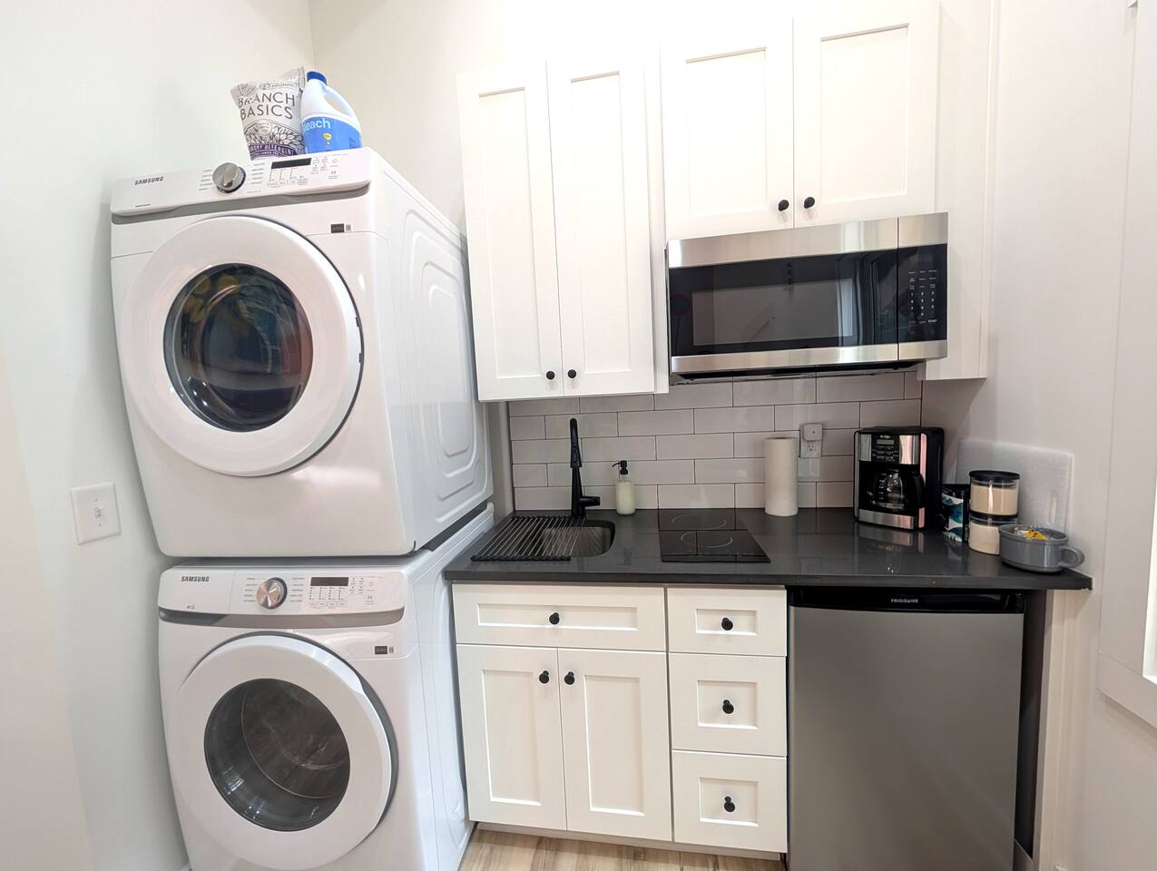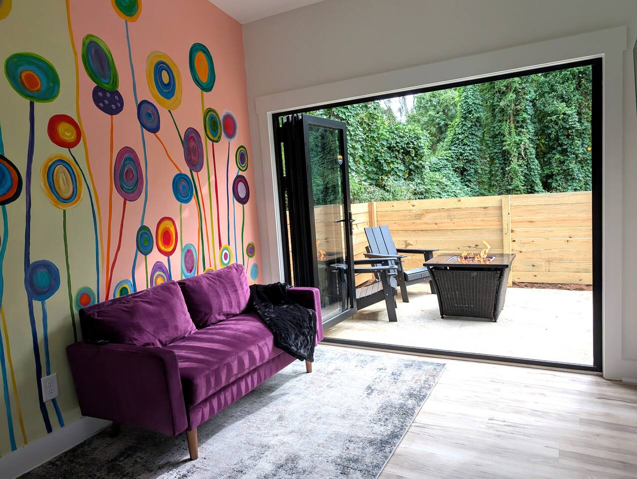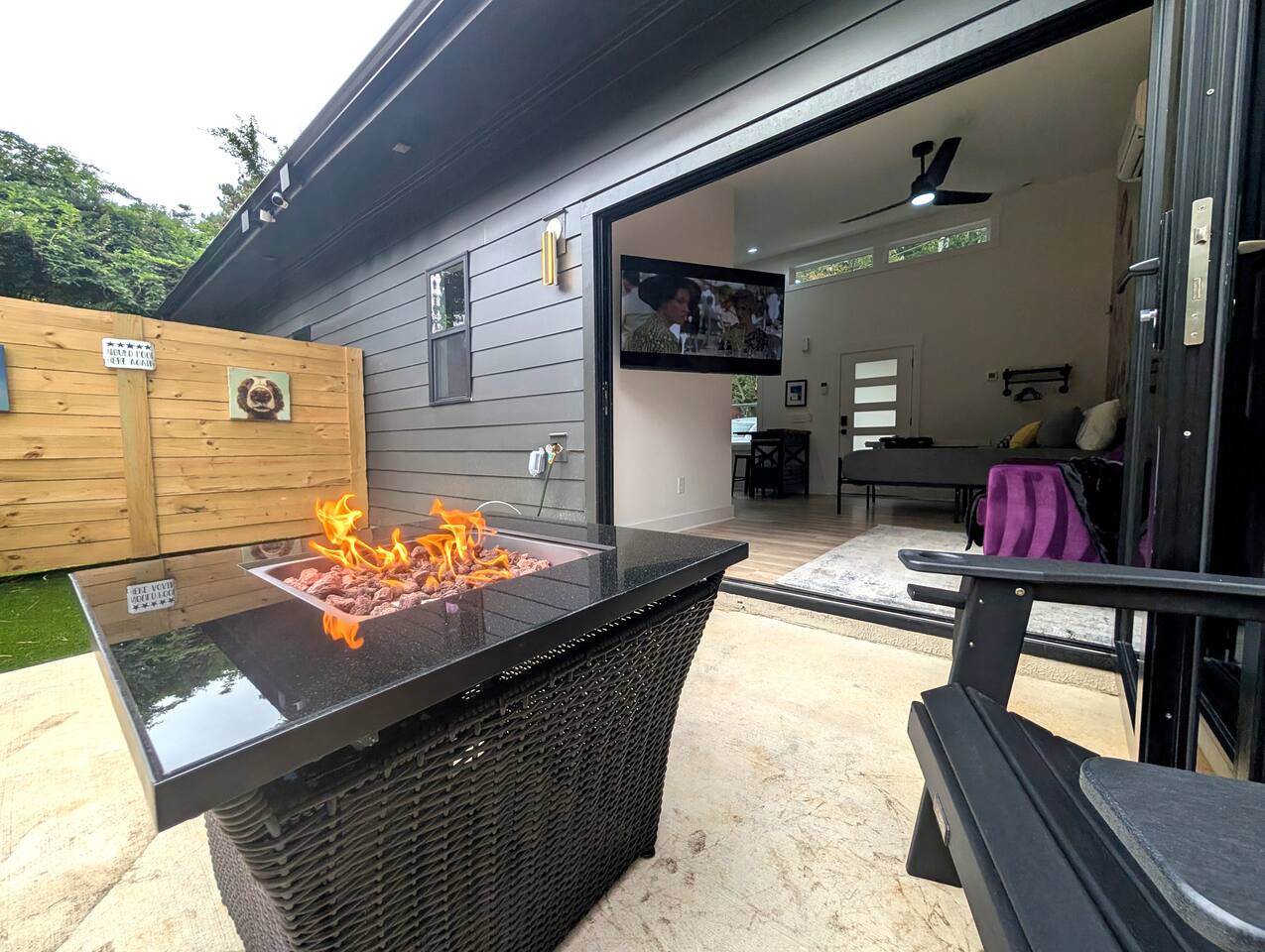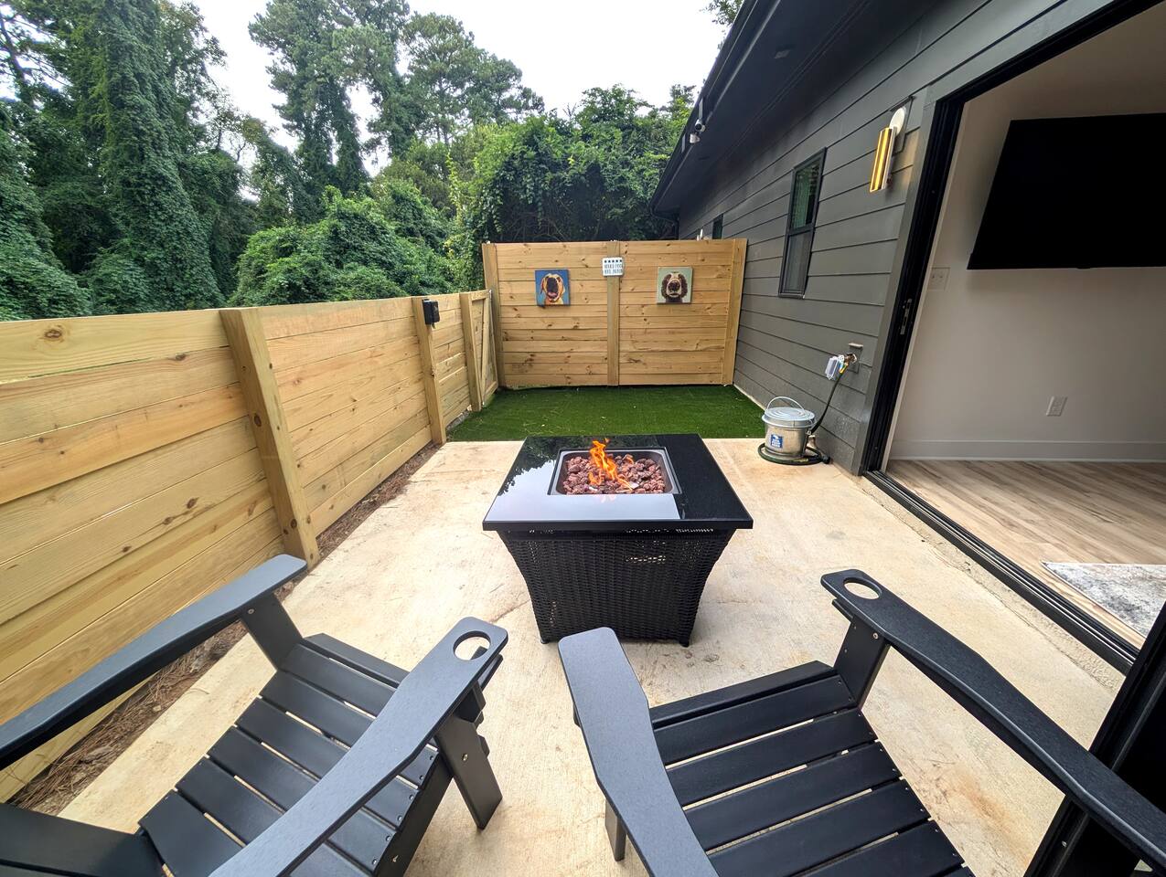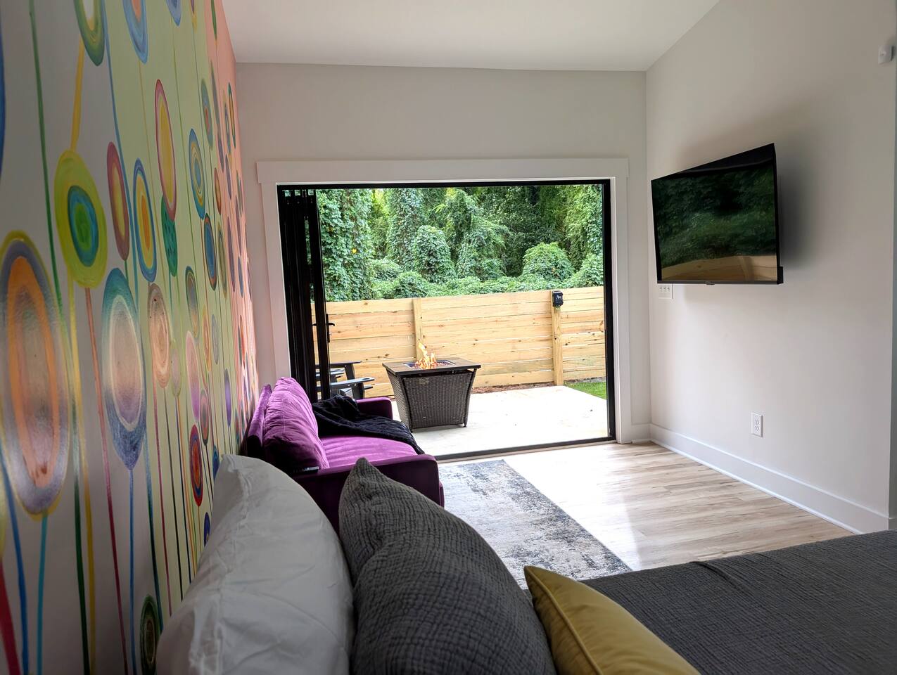 This fresh new duplex rocks a bold, artsy flower mural—totally Insta-worthy! The unit includes a kitchenette and a smart TV that swivels—perfect for watching your favorite shows from either the queen bed or the private patio. Step outside through accordion-style doors to a fully fenced-in patio, ideal for relaxing around the fire pit. The patio also includes a designated potty area for dogs, making it a truly pet-friendly retreat. Come stay where art meets chill.